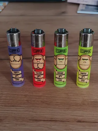 Set di 4 accendini Clipper da collezione israeliani - Design See No Evil, Hear No Evil, Speak No Evil, Do No Evil. - Colori assortiti: viola, rosso, verde chiaro e giallo.