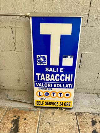 Insegna luminosa per T Tabacchi, con logo Lotto e Self Service 24 Ore. - Insegna T Tabacchi. - Logo Lotto e Self Service 24 Ore. - Riv. N° e Valori Bollati. Altezza 100 cm Larghezza 43 cm Profondità 12 cm Lunghezza staffe 40 cm