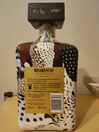 Bottiglia di liquore Disaronno Originale in edizione limitata, in collaborazione con Roberto Cavalli. Un pezzo da collezione. - Design unico con stampa animalier. - Etichetta Disaronno Originale Since 1525. - Tappo nero con logo Disaronno. - condizioni molti buone -annata 2000