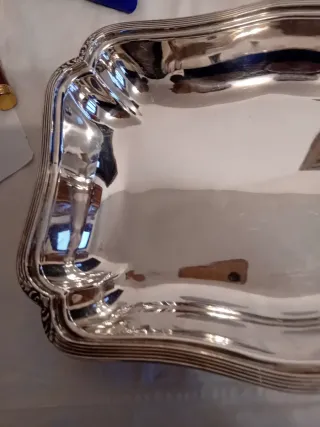 Elegante vassoio vintage, perfetto per servire o come pezzo decorativo. - Design classico con bordi ondulati. - Finitura in metallo argentato lucido. - Stile retrò per ogni occasione.timbro silver salderemo senza scatola