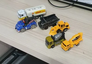 Set di modellini di mezzi da lavoro. - Camion cisterna Shell - Autocarro ribaltabile nero - Gru - Betoniera gialla - Betoniera grigia