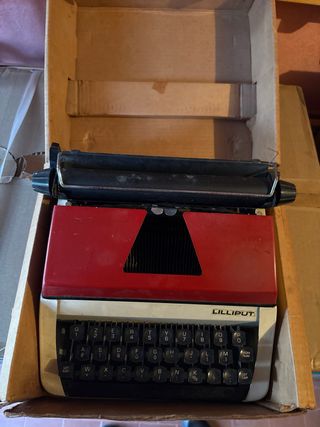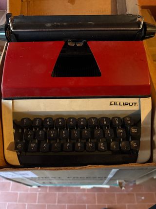 Macchina da scrivere Lilliput di Olivetti, un classico del design italiano.Confezione originale - Colore rosso e bianco. - Tastiera QWERTY con tasti neri. - Logo LILLIPUT ben visibile.