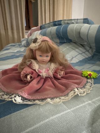 Deliziosa bambola in ceramica con abito rosa e dettagli in pizzo. - Materiale: ceramica e tessuto. - Dettagli: fiocco rosa sul vestito, cappellino con fiorellino e bottone. - Abito: rosa in velluto con maniche lunghe e rifiniture in pizzo bianco.