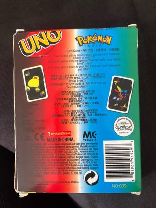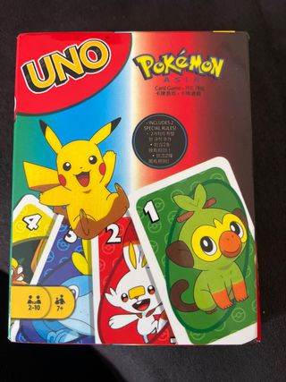 Gioco di carte UNO edizione speciale Pokémon Asia. - Include 2 regole speciali. - Illustrazioni di Pikachu, Grookey e Scorbunny. - Per 2-10 giocatori, dai 7 anni in su.