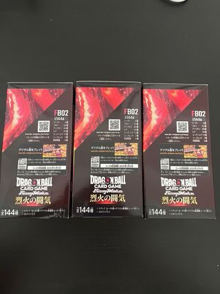 In vendita 3 scatole di carte del Gioco Carte Dragon Ball, set FB02. - Prodotto originale dal Giappone. - Lingua: Giapponese. - Ogni scatola contiene 24 pacchetti booster. - Ogni pacchetto include 6 carte + 1 codice di connessione digitale. - Collezione completa di 144 tipi di carte.