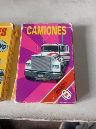Gioco di carte dei camion della marca Fournier. Include illustrazioni di camion, la parola NUOVO sulla copertina e è prodotto a Vitoria, Spagna.