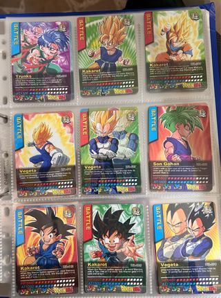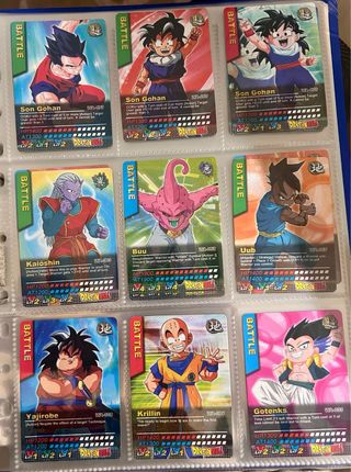 Set di 24 carte del gioco di carte collezionabili Dragon Ball Z. - Carte con personaggi come Trunks, Kakarot, Vegeta e Son Gohan. - Ogni carta presenta statistiche come HP e AT. - Alcune carte hanno abilità speciali descritte.