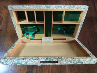 Elegante scatola in pelle, ideale per conservare carte da gioco e fiches. - Rivestimento interno in velluto verde. - Divisori interni in legno. - Decorazione esterna con motivo floreale e dorato.