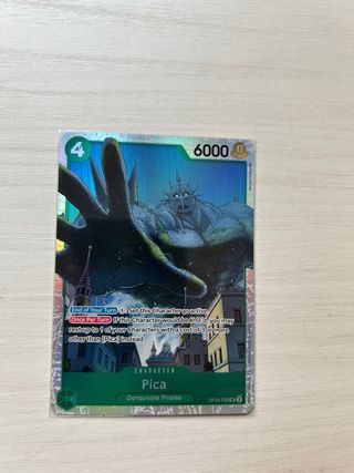 Carta Pica SR dall'espansione Kingdom of Intrigue (OP05) del gioco di carte collezionabili One Piece. - Personaggio: Pica - Mazzo: Donquixote Pirates - Costo: 4 - Potenza: 6000 - Tipo: Character - Numero carta: OP05-032