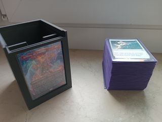 Set di 100 carte proxy Magic, perfette con sleeves viola e deckbox nero per espandere la tua collezione o provare nuove strategie. - 100 carte proxy - 100 sleeves viola -1 Deckbox nero stampato in 3D PLA