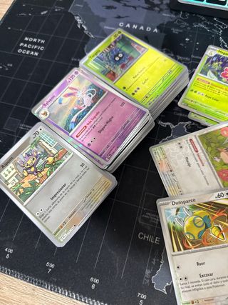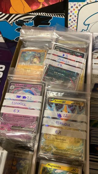 Conjunto di carte Pokémon varie, incluse carte di allenatori e Pokémon. Diversi linguaggi, inglese, spagnolo e giapponese. Carte normali 5 cent, holo e Holo reverse 10 cent