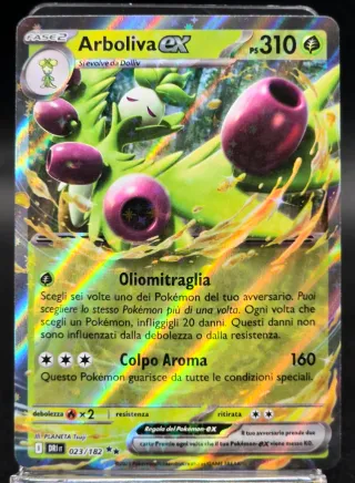 Carta Pokémon di Arboliva ex, numero 023/182 dall'espansione Rivali Predestinati. - Fase 2 - PS 310 - Abilità: Oliomitraglia - Attacco: Colpo Aroma (160 danni) - Debolezza: Fuoco x2 - Resistenza: Psichico - Costo di Ritiro: 2 Energie - Illustratore: PLANETA Tsuji Carta Pokemon Arboliva ex Rivali Predestinati 023/182 RR Italiano Near Mint