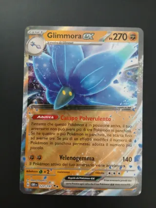 Carta Pokémon Glimmora EX, Fase 1. Fa parte della collezione. - Glimmora EX, numero 123/197. - Abilità: Campo Polverulento. - Attacco: Velenogemma. - PS: 270. - Debolezza x2. - Resistenza. - Ritirata: 3 stelle.
