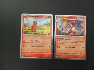 Set di due carte Pokémon: Charmeleon e Charmander. - Charmeleon: Fase 1, PS 90, attacchi Graffio (30) e Lanciafiamme (100). - Charmander: Base, PS 60, attacco Coda in Fiamme (10). - Entrambe le carte sono della serie Pokémon GO. - Carte in italiano.
