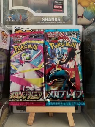 Due bustine di carte Pokémon Mega. - Bustina Mega Sinnoh con Gardevoir. - Bustina Mega Rayquaza con Lucario. - Ogni bustina contiene 5 carte.
