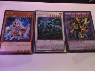Set di 3 carte Yu-Gi-Oh!. - RE: EX (DINOSAURIO/EFECTO) ATK/1900 DEF/1200 - FANGODRAGON FANGOS (DRAGON/SINCRONÍA/EFECTO) ATK/500 DEF/2200 - REY SUPREMO DRAGON HAMBRIENTO VENENOSO (DRAGON/FUSIÓN/EFECTO) ATK/2800 DEF/2000