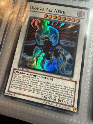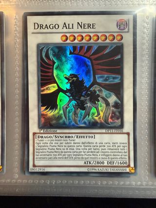 Carta Yu-Gi-Oh! Drago Ali Nere in 1ª Edizione. - Tipo: Drago/Synchro/Effetto - ATK/2800 DEF/1600 - Codice carta: DP11-IT016 - Effetto: Ogni volta che stai per subire danno dall'effetto di una carta, metti invece Segnalino Piuma Nera su questa carta. Questa carta perde 700 ATK per ogni Segnalino Piuma Nera su di essa. Una volta per turno, puoi rimuovere tutti i Segnalini Piuma Nera da questa carta per far perdere ad i mostro controllato dal tuo avversario 700 ATK per ogni Segnalino Piuma Nera, e infliggere danno al tuo avversario pari alla metà dell'ATK perso da quel mostro a causa di questo effetto.