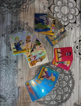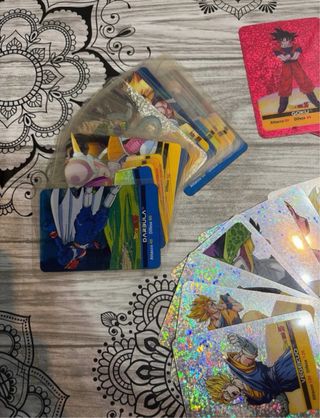 Lotto di 46 lamincards Dragon Ball Z pubblicato da Edibas, 7 holo silver, 2 holo rosse, 7 holo blu, e 30 comuni. Un vero pezzo di storia!