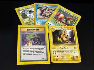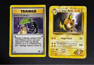 Set di carte Pokémon dei set Gym. Lt surge’s raichu 28/132 inked Erika’s Kindness 103/132 con bordo tagliato (spedita con sleeve gialla visibile nella prima foto) - Giovanni's Nidoran - Misty's Staryu - Erika's Bellsprout - Trainer Erika's Kindness - Lt. Surge's Raichu