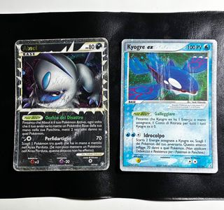 Due carte Pokémon: -Absol 91/102 Battaglie Trionfali -Kyogre ex 95/100 Guardiani dei Cristalli. - Carta Pokémon Absol Base PV 80. - Carta Pokémon Kyogre ex Base PV 100. - Entrambe le carte sono in italiano. Condizioni come da foto.