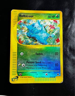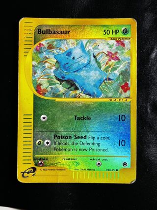 Carta Pokémon Bulbasaur del set Expedition holo reverse 94/165 Pressione centrale visibile in foto - HP: 50 - Attacco: Tackle (10 danni) - Abilità: Poison Seed - Illustratore: Sachi Matoba - Codice: 94/165 - Anno: 2002