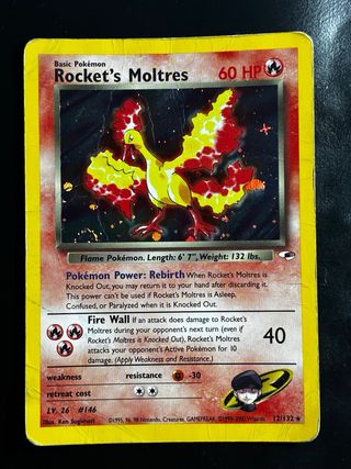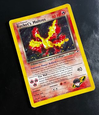 Carta Pokémon holo Rocket's Moltres del set Gym Heroes. Leggero segno sul retro e difetti visibili in foto - Numero: 12/132 - HP: 60 - Livello: 26 - Illustratore: Ken Sugimori - Potere Pokémon: Rebirth - Attacco: Fire Wall