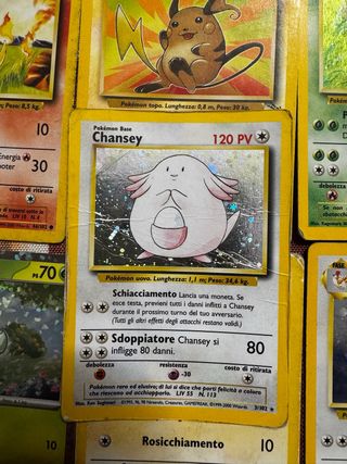 Carta olografica di Chansey, Pokémon Base. - Valore PV: 120 - Attacco Schiacciamento - Attacco Sdoppiatore: 80 danni - Resistenza: -30 - Livello 55 - Illustrazione di Ken Sugimori