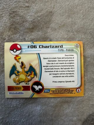 Carta Pokemon Charizard, numero 06. - Illustrazione di Charizard con sfondo fiammeggiante. - Logo Pokemon e nome Charizard visibili.