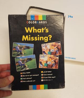 Questo pacchetto comprende 48 photo card in grande formato. Le carte sono divise in 24 coppie di immagini. "Cosa manca?" è stato progettato per sviluppare: capacità di osservazione; identificazione delle anomalie; l'uso di un linguaggio conciso e descrittivo; e la memoria visiva. Carte in buono stato, scatola con segni del tempo come foto allegate - Vendita non professionale di oggetti nuovi non utilizzati, usati o vintage. Le foto sono parte essenziale dell’inserzione e rappresentano lo stato reale degli oggetti. Lo scopo è dare una nuova vita agli oggetti e rientrare parzialmente delle spese sostenute.