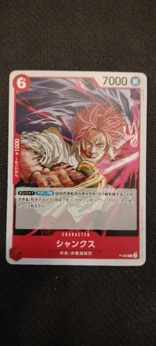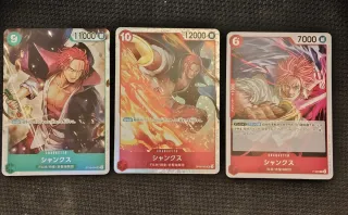 Set di 3 carte del personaggio Shanks dall'universo di One Piece. - Carta 1: Shanks, Potenza 11000, Costo 9. - Carta 2: Shanks, Potenza 12000, Costo 10. - Carta 3: Shanks, Potenza 7000, Costo 6, +1000 Contatore.