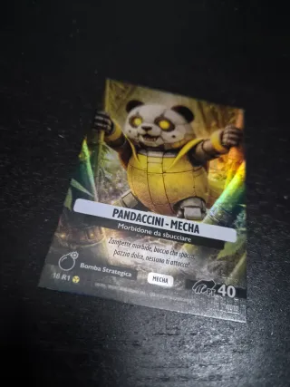Carta Pandaccini - Mecha per giochi di carte. - Nome: Pandaccini - Mecha - Descrizione: Morbidone da sbucciare, Zampette morbide, buccia che spacca, pazzia dolce, nessuno ti attacca! - Tipo: Bomba Strategica - Classe: MECHA - Punti: 40