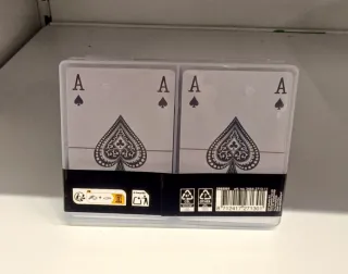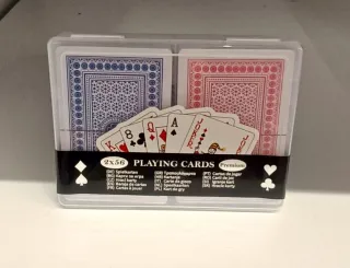 Set di due mazzi di carte da gioco francesi, ideali per ogni tipo di gioco. - 2 mazzi da 56 carte ciascuno. - Design classico con retro blu e rosso. - Custodia trasparente inclusa.