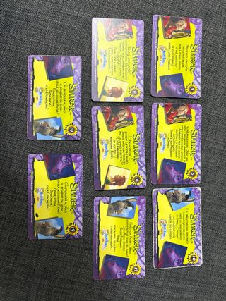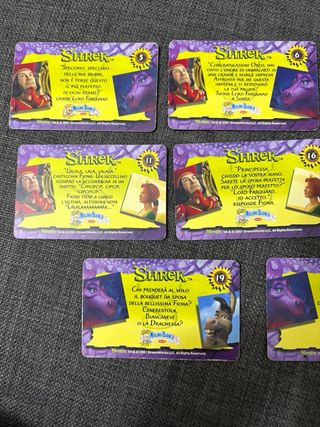 Set di 8 carte animate del film Shrek. Ogni carta presenta un'immagine e una citazione dal film. - Carte da collezione. - Illustrazioni colorate. - Personaggi iconici di Shrek. (1 Doppione)