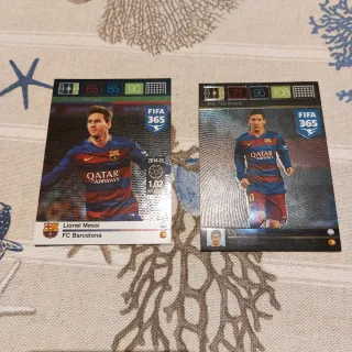 Set di 2 carte Panini FIFA 365 del 2015/16 con Lionel Messi. - Carta 1: Goal Machine con statistiche 65, 85, 90. - Carta 2: Top Master con statistiche 71, 95, 108. - Entrambe le carte raffigurano Lionel Messi con la maglia del FC Barcelona. - Anno: 2014-15.