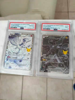 Due carte Pokémon Celebrations del 2021, Zekrom e Reshiram, certificate PSA. - Zekrom FA/ZEKROM #114, PSA 9 MINT. - Reshiram FA/RESHIRAM #113, PSA 10 GEM MT. - Entrambe dalla collezione Classic Collection Base Set ITA.