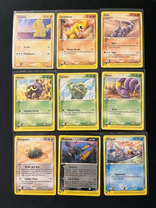 Lotto di 9 carte vintage Pokémon del set EX Sandstorm: Pikachu ITA Sandshrew ENG Onix ENG Seedot ENG Cacnea ENG Ekans ENG Dunsparce ENG Murkrow ENG Wingull ENG Tutte in ottime condizioni. Per informazioni e foto singole chiedete in DM!