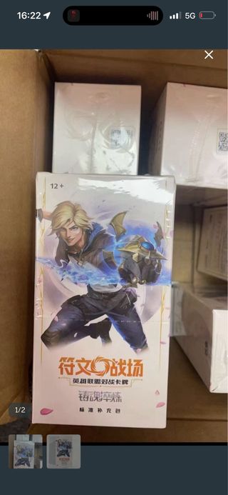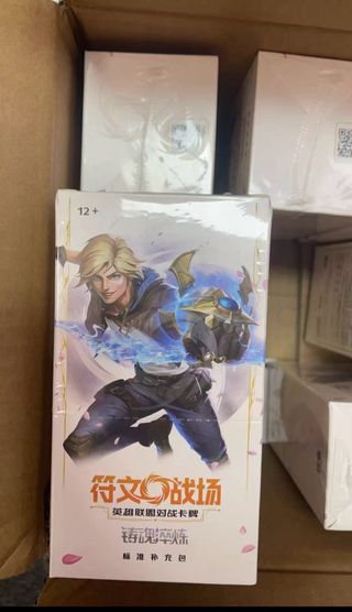 Box di carte collezionabili a tema League of Legends. - Edizione cinese. - Illustrazione di Ezreal sulla confezione. - Etichetta 12+ e Campo di Rune sul fronte.