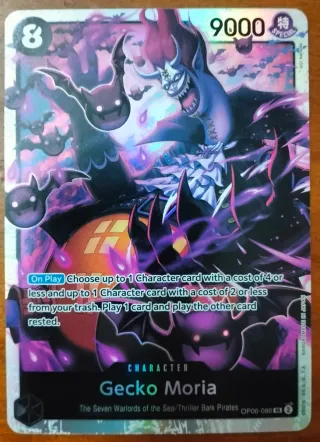 Carta Gecko Moria SR dall'espansione Side: Earth del gioco di carte collezionabili One Piece. - Numero carta: OP06-086 - Rarità: SR (Super Rare) - Effetto On Play: Scegli fino a 1 carta Personaggio con costo 4 o inferiore e fino a 1 carta Personaggio con costo 2 o inferiore dal tuo cimitero. Gioca 1 carta e gioca l'altra carta riposata.