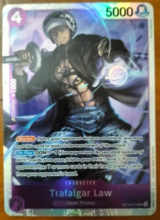 Carta Trafalgar Law per il gioco di carte collezionabili One Piece. - Numero carta: ST10-010EX - Potenza: 5000 - Costo: 4 - Counter: +1000 - Abilità: Blocker, On Play DON!! -1 - Mazzo: Heart Pirates