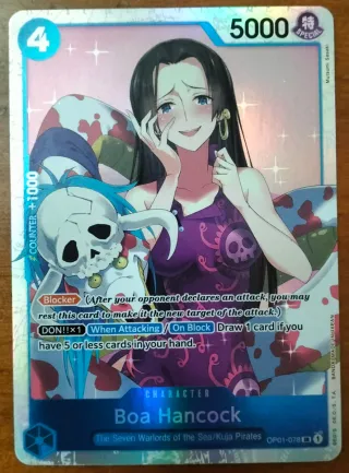 Carta Boa Hancock SR per il gioco di carte One Piece. - Personaggio: Boa Hancock - Rarità: SR (Super Rare) - Effetto Blocker - Costo: 4 - Potenza: 5000 - Counter: +1000 - Mazzo: OP01-078 - Illustrazione di Mutsumi Sasaki