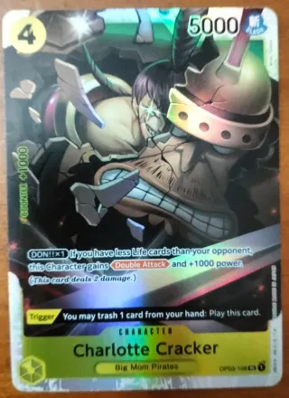 Carta Charlotte Cracker SR, numero OP03-108, del gioco di carte collezionabili One Piece. - Personaggio: Charlotte Cracker - Mazzo: Big Mom Pirates - Potenza: 5000 - Contatore: +1000 - Effetto: DON!!x1 Se hai meno Life card del tuo avversario, questo Personaggio ottiene Doppio Attacco e +1000 potenza. (Questa carta infligge 2 danni.) - Trigger: Puoi scartare 1 carta dalla tua mano: Gioca questa carta.