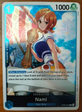 Carta rara del personaggio Nami, dal gioco di carte collezionabili One Piece. - Numero carta: OP09-050 - Tipo: Personaggio - Costo: 1 - Potenza: 1000 - Contatore: +1000 - Attributo: East Blue - Effetto: Quando Attacca, guarda le prime 5 carte del tuo mazzo; rivela fino a 1 carta Evento Blu e aggiungila alla tua mano. Poi, metti le restanti carte in fondo al tuo mazzo in qualsiasi ordine.