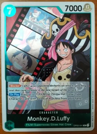 Carta Monkey D. Luffy del gioco di carte collezionabili One Piece, codice OP02-041. - Tipo: Personaggio - Costo: 7 - Potere: 7000 - Attributi: FILM / Supernovas / Cappello di Paglia - Abilità: Blocker, On Play