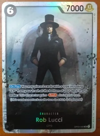 Carta Rob Lucci SR dal gioco di carte One Piece. - Costo: 6 - Potenza: 7000 - Tipo: Personaggio - Attributo: CP9 - Abilità On Play: Puoi mettere 2 carte con tipo CP dal tuo cimitero in fondo al tuo mazzo. - Abilità Rush: Questo personaggio ottiene Rush in questo turno. - La carta può attaccare nel turno in cui viene giocata.