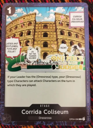 Carta promo Corrida Coliseum dal set Judge di One Piece Card Game. Codice OP04-096. - Carta promo foil. - Tipo: Dressrosa. - Effetto: Se il tuo Leader ha il tipo {Dressrosa}, i tuoi Personaggi di tipo {Dressrosa} possono attaccare Personaggi nel turno in cui vengono giocati.