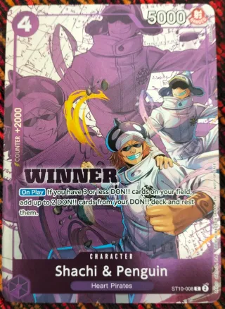 Carta promo Winner di Shachi & Penguin dal set ST10. - Personaggio: Shachi & Penguin - Mazzo: Heart Pirates - Potenza: 5000 - Contatore: +2000 - Effetto On Play: Se hai 3 o meno carte DON!! sul campo, aggiungi fino a 2 carte DON!! dal tuo mazzo DON!! e mettile a riposo.