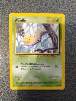 Carta Pokémon Base Weedle, numero 69/102. - Pokémon: Weedle - Tipo: Base - PV: 40 - Attacco: Velenospina - Debolezza: Fuoco - Resistenza: Psico - Costo di ritirata: 1