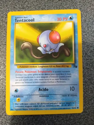 Carta Pokémon Base di Tentacool. - Potere Pokémon: Sviqnarsela - Attacco: Acido - Debolezza: 4 - Resistenza: 10 - Costo di ritirata: 1 - Illustratore: Kagemaru Himeno