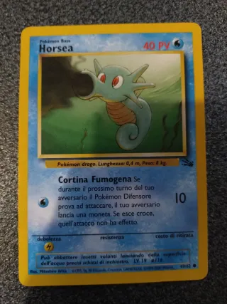 Carta Pokémon Base di Horsea, numero 49/62. - Attacco: Cortina Fumogena - PV: 40 - Livello: 19 - Illustrazione di Mitsuhiro Arita