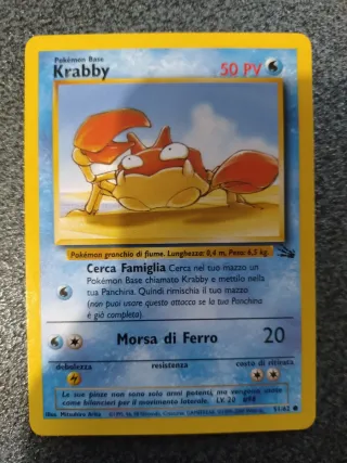 Carta Pokémon Base di Krabby, edizione italiana. - Livello 20 - PV: 50 - Attacco: Morsa di Ferro (20 danni) - Debolezza: Fulmine - Resistenza: Nessuna - Costo di ritirata: 2 energie - Illustratore: Mitsuhiro Arita